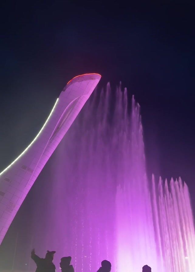 nighttime scene with a large, white, curved structure illuminated by white lights and a red light at the top. In front of the structure, a fountain shoots water into the air, illuminated with a purple light that changes to white. Several people stand or sit near the fountain, some holding phones, seemingly taking pictures or video. The background is a dark, unlit sky.