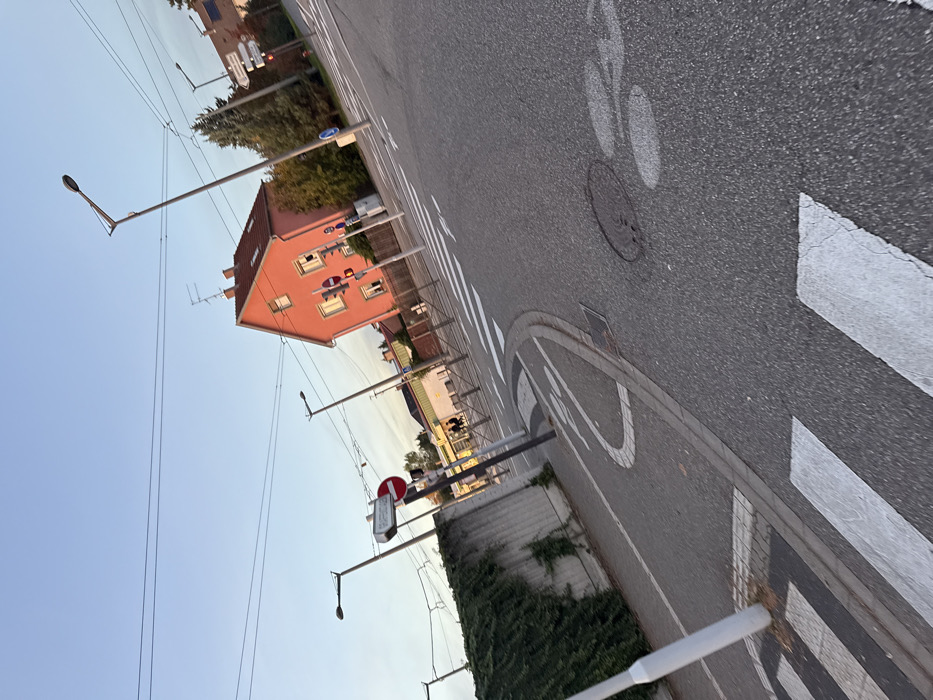 The image displays an angled street-level view of an urban intersection in Illkirch-Graffenstaden, France, under a clear, pale blue sky illuminated by warm, low-angle sunlight, consistent with late afternoon or early morning. The foreground features an asphalt road surface with distinct white pedestrian crossing stripes. Adjacent to these, a paved area includes a curved white line and a partially visible white bicycle symbol, indicating a bicycle path. A circular metal manhole cover is embedded in the asphalt. To the left, a concrete retaining wall is densely covered with green ivy or climbing plants. A white, vertical pole rises from the lower-left. In the mid-ground, a network of overhead electrical wires is visible against the sky. Multiple grey street lampposts illuminate the scene. A central pole near the intersection displays a red circular "No Entry" sign with a white horizontal bar, positioned above another obscured white rectangular sign. Further to the right, a lamppost supports a red traffic light and a white rectangular directional sign with black arrows. A blue circular sign with a white bicycle symbol, denoting a mandatory cycle path, is visible on the right side of the street. The prominent structure in the mid-right is a two-story building painted in a salmon-pink or orange color, featuring a reddish-brown tiled roof with a television antenna. The building has multiple windows; the upper-right windows appear to have partially broken or open shutters. A low wooden fence extends across the front of this property. To the left of this building, a yellow-fronted building is partially visible in the background. Two indistinct human figures are discernible near the yellow building, appearing to be walking or standing. Several trees, including a dark green coniferous tree and deciduous trees, are scattered around the main building and in the background.