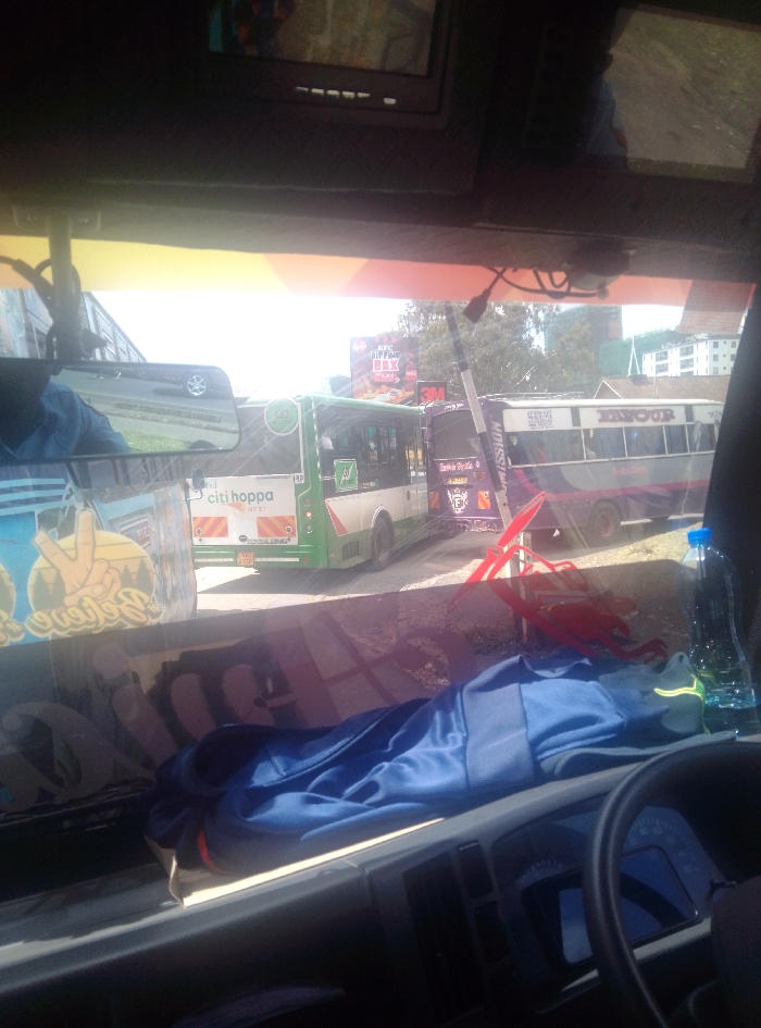 The image is a first-person perspective captured from inside a vehicle, looking forward through its windshield. **Foreground:** The vehicle's dark-colored dashboard occupies the lower third of the frame, showing air vents, controls, and a portion of a black steering wheel on the right. A folded blue garment, resembling a jacket or sweatshirt, is draped over the dashboard on the passenger side. A translucent plastic water bottle with a blue cap stands upright on the right side of the dashboard. A rectangular rear-view mirror is affixed to the windshield frame, reflecting a partial view of a person in a blue shirt. The top edge of the windshield reveals a sun visor and an electronic screen or monitor. **Midground:** Outside the vehicle, a multi-lane road is visible, containing several parked or slow-moving public transport buses under bright daylight. Directly ahead, a green and white "citi hoppa NEXT" bus, identified as a King Long model with license plate KBY 402P, is prominently displayed. Behind this bus, a purple and grey bus featuring the name "FAVOUR" on its side and "MISSION" vertically on its rear is visible. Scattered red, angular objects, possibly components of traffic control barriers, lie on the ground between the vehicles. **Background:** The background includes a mix of urban infrastructure and natural elements. Trees and dense green foliage line the road. In the distance, multiple multi-story buildings are observable. A large billboard advertising "KFC" and "INARI MAX," with the "3M" logo, stands prominently above the buses. A clear, bright sky is visible above the horizon. **Location:** The scene depicts a congested urban street in Nairobi, Kenya. This identification is based on the specific livery and branding of the buses ("citi hoppa NEXT," "FAVOUR"), which are common public transport operators in Nairobi, and the Kenyan vehicle registration plate format (KBY 402P).