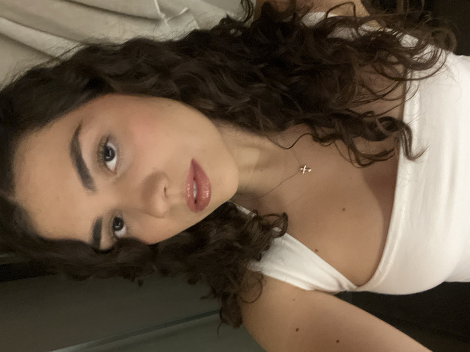 A young woman with curly dark hair and fair skin is wearing a white top and a delicate necklace with a cross pendant