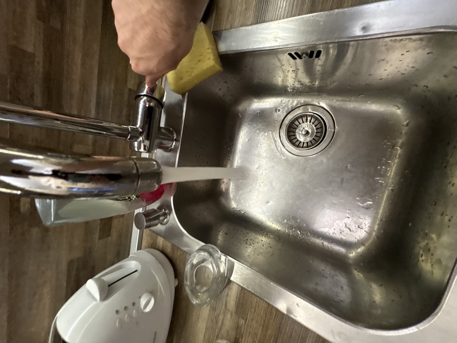 - "An overhead-angled view in a kitchen in Sofia, Bulgaria, depicts a stainless steel sink with water actively running from a chrome gooseneck faucet" by FM-re7Sv1, licensed under CC BY 4.0