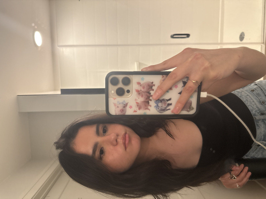 An individual is captured in a mirror selfie taken indoors, possibly within a bathroom or dressing area in Austin, United States of America. The exact location within the city cannot be determined from the visual evidence. The subject is a person with dark, medium-length hair, wearing a black tank top and light blue denim jeans. They are holding a smartphone, likely an iPhone (identified by its triple-lens camera array), in their right hand, with a white charging cable connected to the device's port. The phone is encased in a clear cover adorned with multiple cartoon pig illustrations and small stars. The subject wears a thin gold-colored ring on the ring finger of their right hand, and two additional rings are visible on the index and pinky fingers of their left hand. A dark-colored tumbler or bottle is partially visible, held by the subject's left hand below the smartphone. The background, reflected in the mirror, consists of light-colored walls, possibly tiled. To the right, a white sliding door or shower partition with a vertical black handle is visible. A recessed light fixture is present on the ceiling.