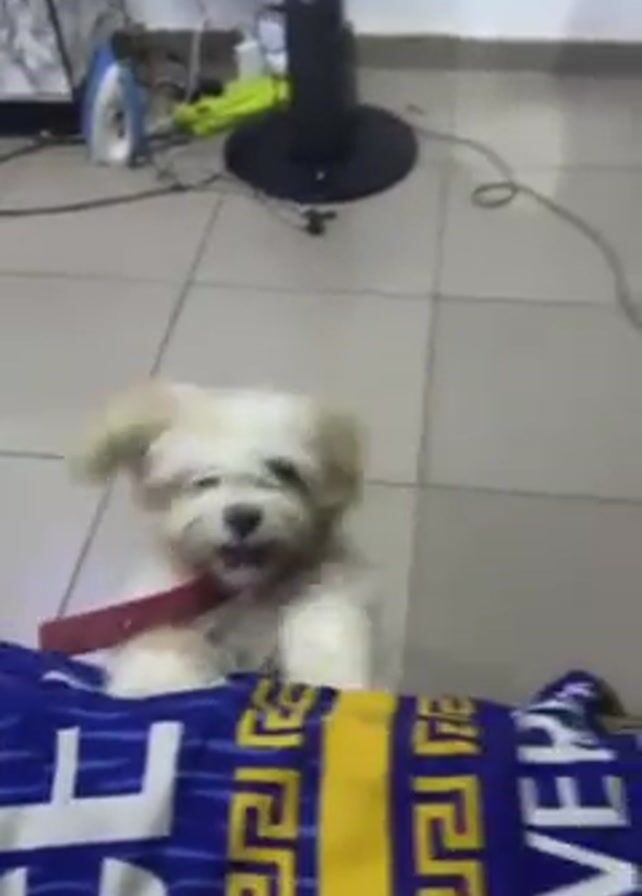 small, white dog with a red collar on a tiled floor, looking up at the camera. The dog appears to be standing on its hind legs, with its front paws resting on something covered in a blue and yellow patterned fabric. In the background, an iron, a floor fan, and other items are visible against a white wall. The dog is panting and seems eager for attention.