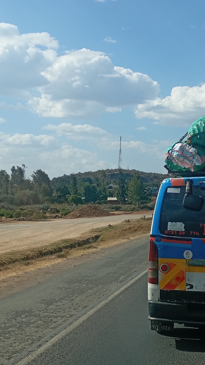 A blue and white "Toyota" bus, laden with luggage on its roof, occupies the right side of the frame, partially obscuring the view. Beyond, a dusty road and a grassy shoulder lead to a scene of sparse vegetation and a small hill. A tall transmission tower stands atop the hill, overlooking a scattering of small structures and trees. The sky is bright blue, filled with puffy white clouds. The overall impression is of a landscape somewhere rural or remote.