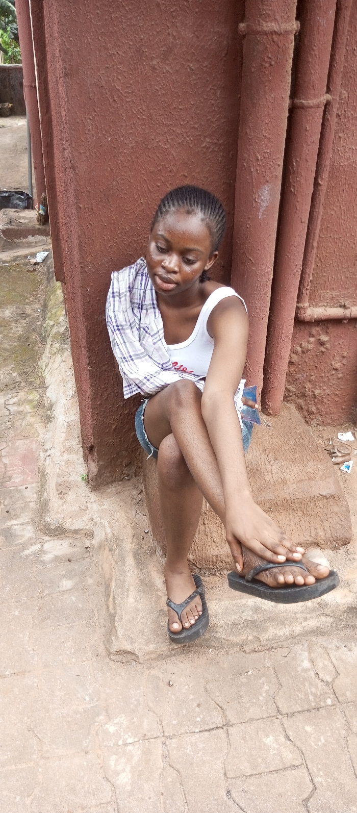 A young female, appearing to be in her late teens or early twenties, is seated outdoors, positioned against a textured reddish-brown wall or pillar. Her dark hair is styled in cornrows. She wears a white sleeveless top, blue denim shorts, and black flip-flops. A white and blue plaid shirt is draped over her left shoulder. She is seated with her legs crossed, left over right, and her left hand is resting on or adjusting her left foot and sandal. Her gaze is directed downwards towards her left foot. The ground in the immediate foreground is paved with worn, light-colored concrete pavers. To the subject's right, two reddish-brown pipes run vertically along the wall. To her left, an area of concrete steps and debris, including a black plastic bag, are visible. Green foliage can be seen in the distant background on the left. The image contains no identifiable landmarks or specific street features to determine a precise location within Abuja, Nigeria.