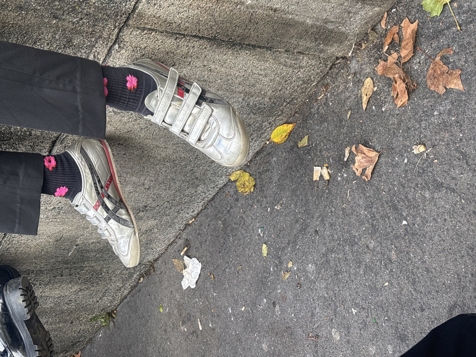 This image depicts the lower extremities of two individuals in an urban environment in Paris, France. The exact location within the city is not discernible. The primary subject's feet are seen dangling above a dark asphalt ground, suggesting they are seated on a weathered, light grey concrete or stone ledge that spans the middle ground of the frame. This individual wears black trousers, black ankle socks adorned with multiple bright pink floral patterns, and silver athletic shoes. The left shoe is an Onitsuka Tiger Mexico 66-style model with laces, featuring black stripes outlined in red and a red accent on the sole. The right shoe is a similar silver athletic shoe, also with black stripes and red sole accents, but features three silver hook-and-loop (Velcro) straps instead of laces. On the asphalt ground below, scattered dry leaves in various shades of brown, yellow, and green are visible, alongside multiple white cigarette butts and a crumpled piece of white paper or tissue. In the upper left quadrant, the heavy, lugged sole of a black boot belonging to a second individual is partially visible, resting on the concrete ledge.