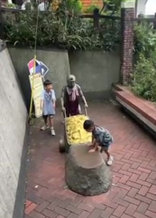 two young boys interacting with a statue of a man pushing a wheelbarrow filled with yellow nuggets. One boy, wearing a blue shirt and shorts, stands beside the statue, while the other, dressed in a patterned shirt and shorts with sunglasses, climbs onto a large stone in front of the wheelbarrow. The scene is set on a brick path with a low wall on one side and a brick border on the other. Green plants and trees are visible in the background. A sign with text and warning symbols stands to the left of the statue.