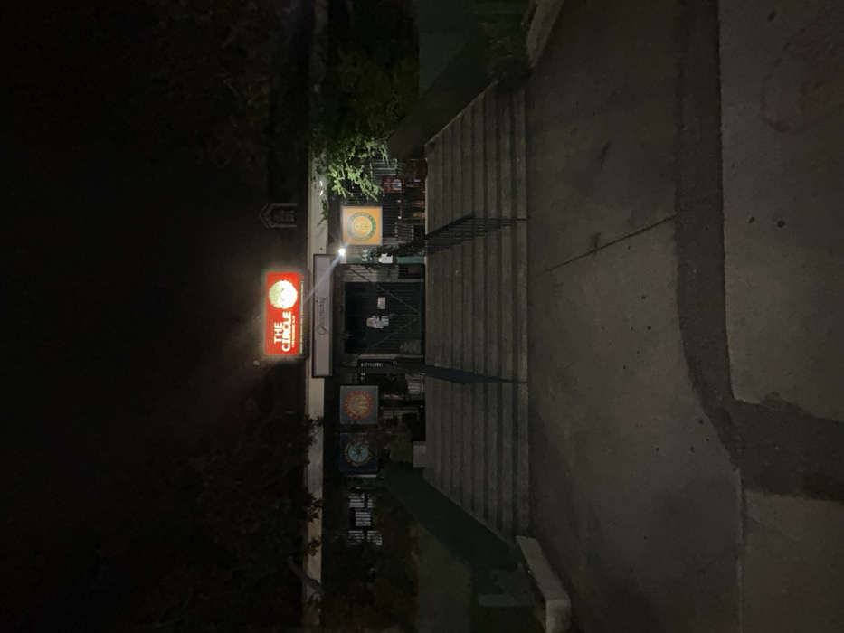A vertical night shot of an outdoor business entrance. "The Circle" sign glows red above the entrance stairs and displays. Illuminated decor lights the walkway. A dark concrete walkway is prominent.