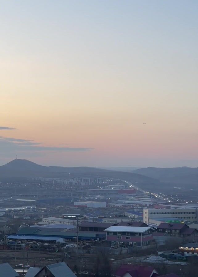 wide cityscape at dusk. The sky is pale blue fading into a soft pink and orange near the horizon. A distant mountain silhouette is visible on the left, marked by a tall transmission tower on its peak. Between the mountain and the foreground, a city spreads out with numerous buildings of varying heights, and a highway lined with streetlights runs through the urban area. In the foreground, there are mainly smaller houses with pitched roofs, some painted in pastel colors. An airplane is a small speck in the sky.