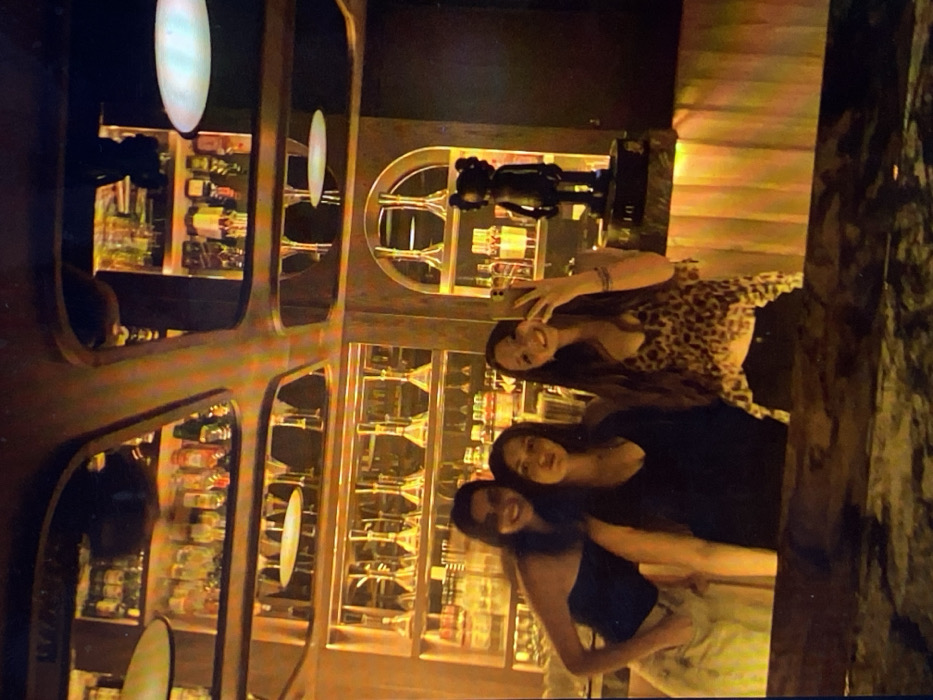 Three women pose for a selfie in front of a backlit bar. The bar is sectioned with wooden frames, displaying bottles and glassware. Above the women is a small statue of a figure with crossed-out eyes. The woman at the top of the frame is taking the photo. Her outfit is animal print. The middle woman wears a black top, while the woman at the bottom is in a dark tank top with light pants. The setting is dimly lit with warm tones.