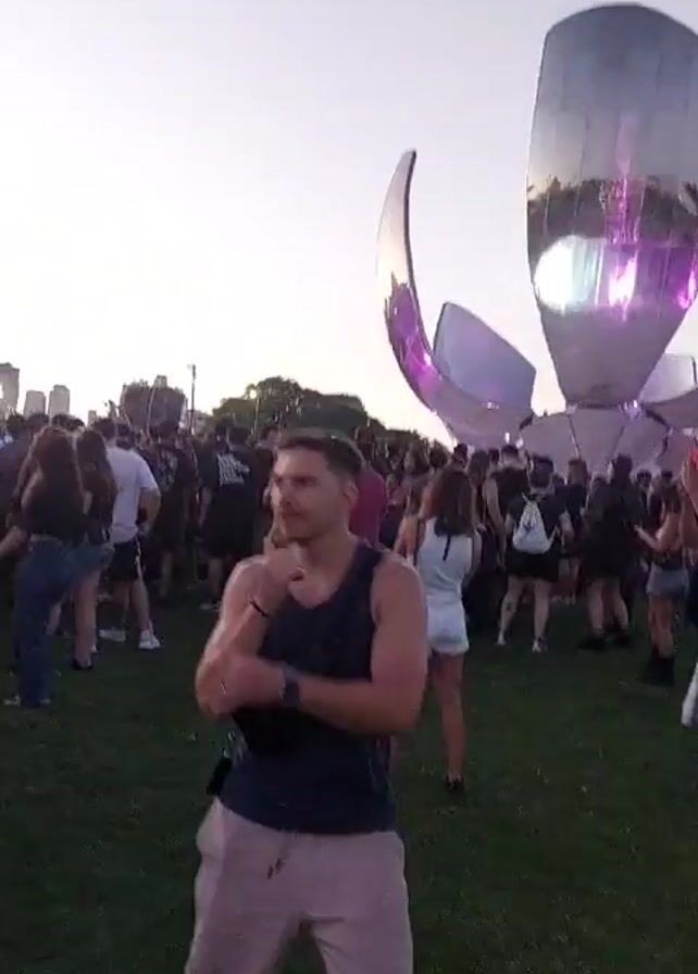 The video depicts a crowd of people gathered in an outdoor area with green grass. In the foreground, a man wearing a blue tank top and tan shorts is walking and gesturing towards the camera. Behind him, there is a large, metallic flower-shaped structure, possibly a sculpture or art installation. The crowd appears to be diverse, with people of various ages and wearing different clothing. The atmosphere seems lively, suggesting an event or gathering is taking place. The lighting indicates it is either dusk or dawn, with the sky appearing light and slightly overcast. The background includes buildings and trees, indicating an urban or park-like setting.