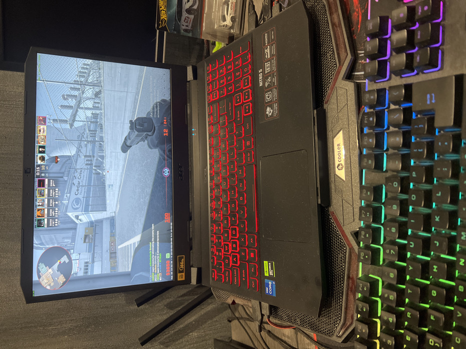 An indoor gaming setup is depicted. A black Acer Nitro 5 gaming laptop rests on a dark grey and black "Cooler" branded cooling pad. The laptop screen displays a first-person shooter video game, showing a weapon (pistol) in the player's view, a minimap in the upper-left, and an in-game environment featuring a building labeled "Cedar Creek Energy Power Plant." The laptop's keyboard is illuminated with red backlighting. Visible decals on the laptop indicate an "Intel Core i7" processor and "NVIDIA GeForce RTX" graphics. In the foreground, an external mechanical keyboard with multi-color RGB backlighting (green, blue, and purple zones) is present. To the right of the laptop, a packaged white Hot Wheels Porsche GT3 toy car is partially visible, with another smaller white toy car beneath it. The background consists of a dark, textured wall. The scene is located in Lovech, Bulgaria.