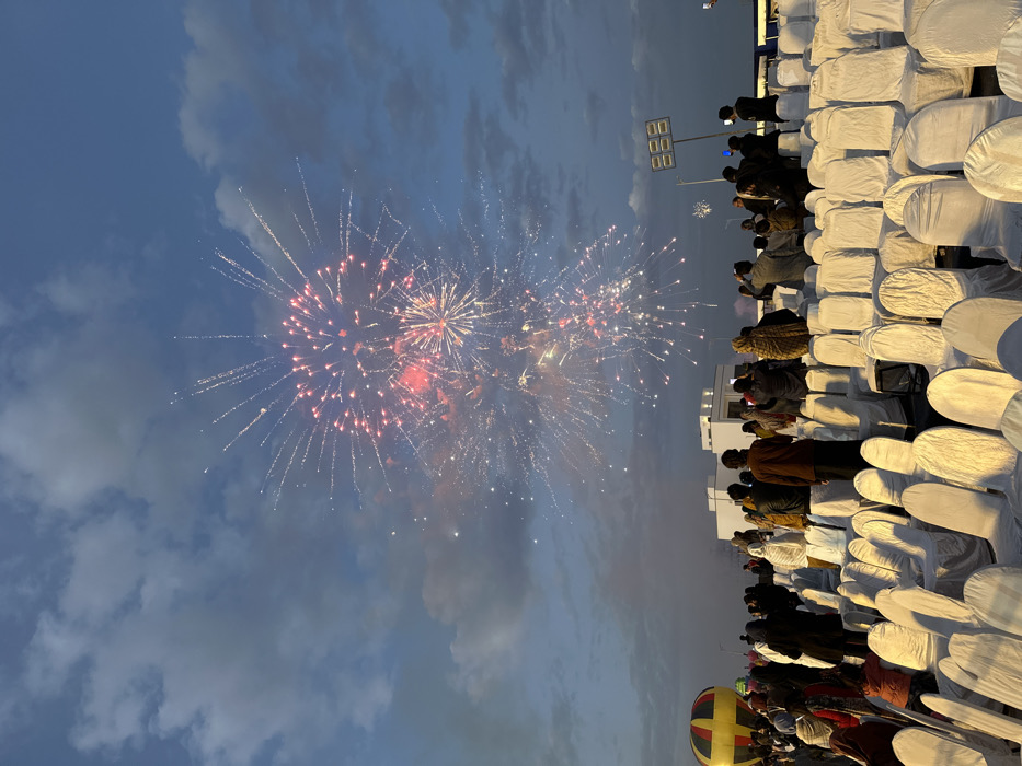 Fireworks illuminate a cloudy evening sky, casting light on an adjacent stadium crowd seated in rows of white chairs