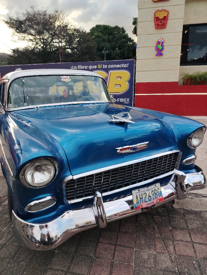 A vibrant blue 1955 Chevrolet Bel Air is prominently displayed, featuring a gleaming chrome bumper and grill, and a distinctive hood ornament. The vehicle's license plate reads "AH269BG." Behind the car, a large advertisement for a FIBEX telecom company is visible, with the tagline "La fibra que si te conecta!" (The fiber that connects you!). To the right of the car is a building with red and white accents, adorned with illuminated food-themed signs. The scene is set outdoors, likely on a street or parking area.