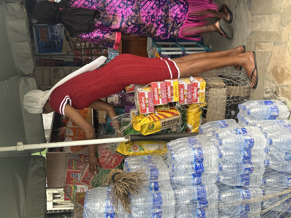 The image depicts a market stall or roadside shop in Badore, Nigeria, operating under a light-colored canopy