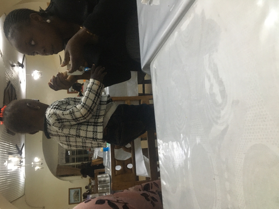 An adult is interacting with a child at a table. The adult, on the right, is dark-skinned with braided hair. The child is on the left and is also dark-skinned. The child is wearing a patterned black and white jacket, with black pants. They are standing at a white table. The interior appears to be a dining or living room, evidenced by chairs, a painting, and light fixtures. The photo is taken indoors, with a slightly rotated perspective.