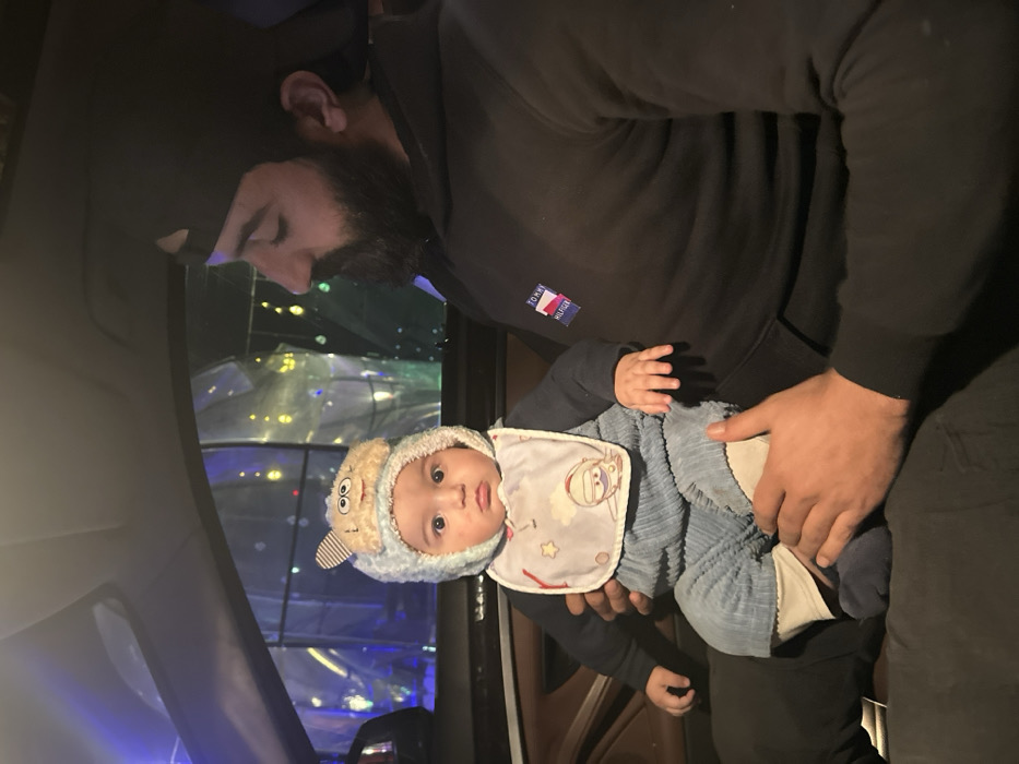 A man wearing a black hoodie and black hat holds a baby. The baby wears a light blue hat and a bib with a cartoon character on it. They appear to be in a car at night, with blurred lights visible through the window. The man is looking down at the baby. A Tommy Hilfiger logo is visible on the man's hoodie.