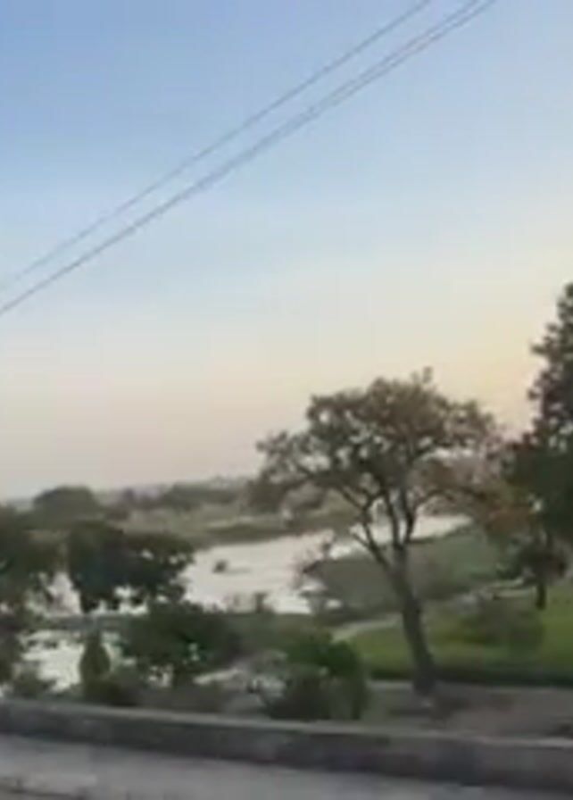 The camera, likely handheld inside a moving vehicle, focuses on a water landscape seen through a side window. Trees and vegetation line the riverbank, gradually transitioning to a more open landscape in the distance. The sky is a gradient of blue and light orange, suggesting either sunrise or sunset. An overhead power line stretches across the sky. A bridge with a concrete barrier is visible in the foreground as the vehicle traverses it. No people or interactions are clearly discernible.