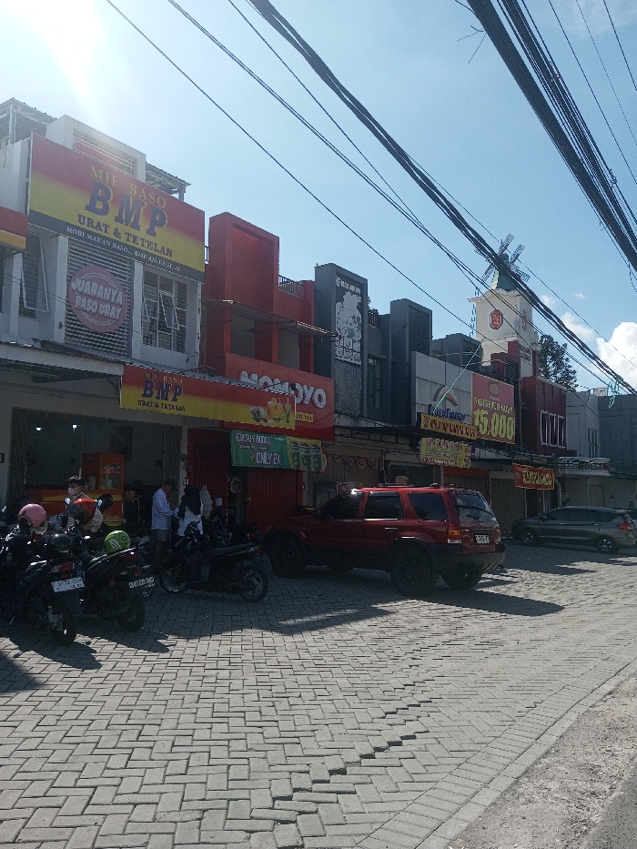 The image displays a daytime street scene in Ban Phonhxavanh, Laos, under a clear blue sky with overhead utility cables. A row of commercial buildings lines the left side, featuring multiple businesses. The leftmost building has a prominent yellow and red sign for "MIE BASO BMP URAT & TETELAN" with an open ground floor. Approximately 7-10 individuals are visible inside or near the entrance of this establishment. Adjacent buildings display signs for "MOMOYO" and "NASI AYAM GEPREK 15.000." In the background, a white tower topped with a windmill-like structure is discernible. The foreground consists of a grey interlocking paver surface used for parking. Five motorcycles are parked near the "MIE BASO BMP" entrance, one with a pink helmet on its seat. A red SUV, possibly a Ford Escape, is parked facing away from the viewer, displaying a partially visible license plate beginning "D 1642." Further down the paved area, a dark sedan is also parked. Shadows are cast by buildings and vehicles, indicating direct sunlight.