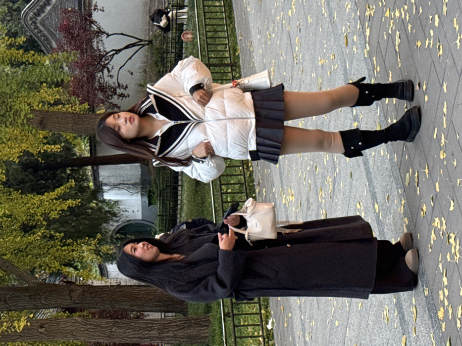Two East Asian females are observed standing on a grey paved pathway in Xicheng District, China, under natural daylight conditions. The ground is partially covered with scattered yellow ginkgo leaves. The female on the left is positioned facing slightly to her right, appearing to speak or smile. She wears a dark, possibly charcoal, long coat tied at the waist, over dark wide-leg trousers, and light-colored flat shoes. She carries a small, light-beige structured handbag in her left hand. Her hair is long, straight, and dark. The female on the right stands facing slightly to her left, with a neutral expression, looking towards the viewer's right. She wears a white puffer jacket with a black and white sailor-style collar, a white shirt, a dark grey pleated mini skirt, skin-toned tights, and black knee-high flat boots. Her hands are in her jacket pockets, and a small white handbag with a red accessory is visible on her left side. Her hair is long, straight, and dark. Behind the subjects, a dark green metal fence separates the pathway from a garden area. The background features several trees, including those with yellow and red foliage, and traditional Chinese architectural elements. These include a white wall with dark trim, a circular gateway or 'moon gate' to the left, and dark-tiled rooflines of a building to the right. Vines are visible on the white wall. A distant figure is faintly visible in the far right background.