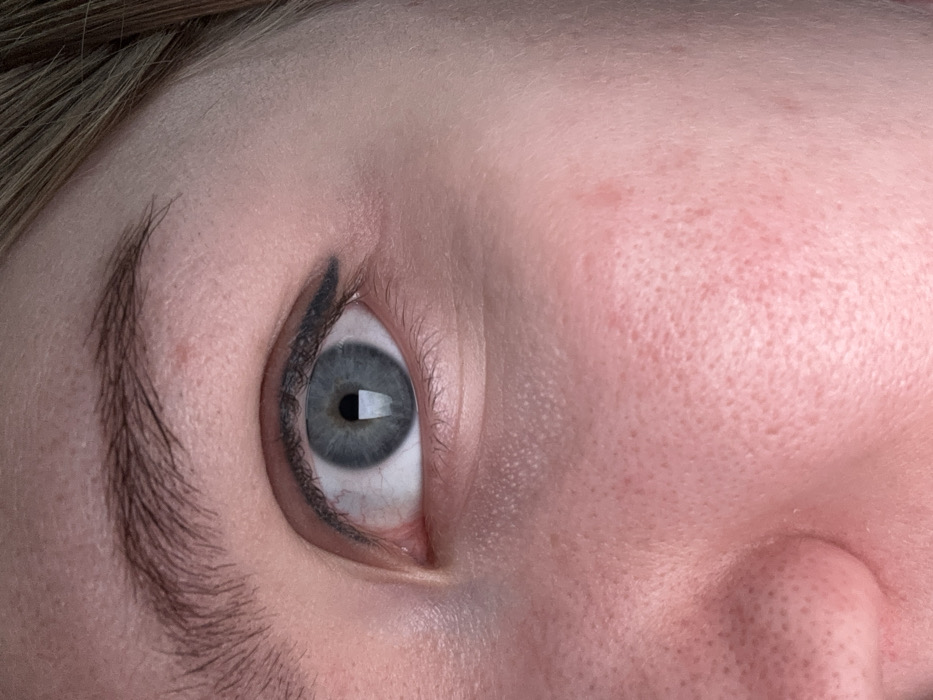 The image provides an extreme close-up of a human right eye, centered within the frame. The subject's iris is a distinct gray-blue, encompassing a circular, black pupil that reflects a prominent vertical rectangular light source, suggestive of a screen or window. A precise black winged eyeliner is applied along the upper eyelid, extending outwards beyond the eye's outer corner. The visible sclera is white with minor reddish capillary networks, particularly evident towards the inner canthus. Above the eye, a segment of a light brown eyebrow with natural hair growth is visible. The surrounding skin is fair-toned, displaying discernible pores and a subtle blush or reddish tint on the lower-left portion of the frame, near the upper cheek and what appears to be the bridge of the nose. Strands of light brown head hair are visible along the far-right edge of the image. The scene is static, captured under ambient lighting conditions, in the city of Nizhnekamsk, Russia.
