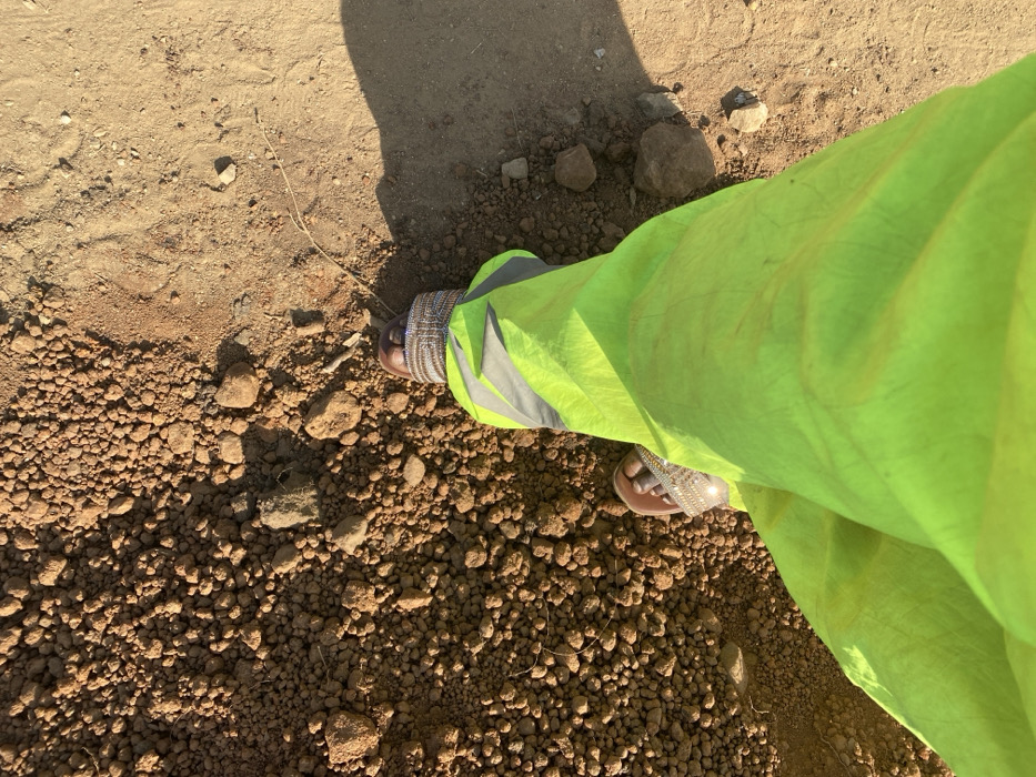 A ground-level view captures a person's legs wearing bright green, loose-fitting pants. The feet are adorned with sandals; one has a beaded ankle strap, and the other appears to be embellished. The person stands on varied terrain: one side consists of fine, dry soil, and the other is covered with small pebbles and rocks. The setting appears to be outdoors, bathed in natural light.