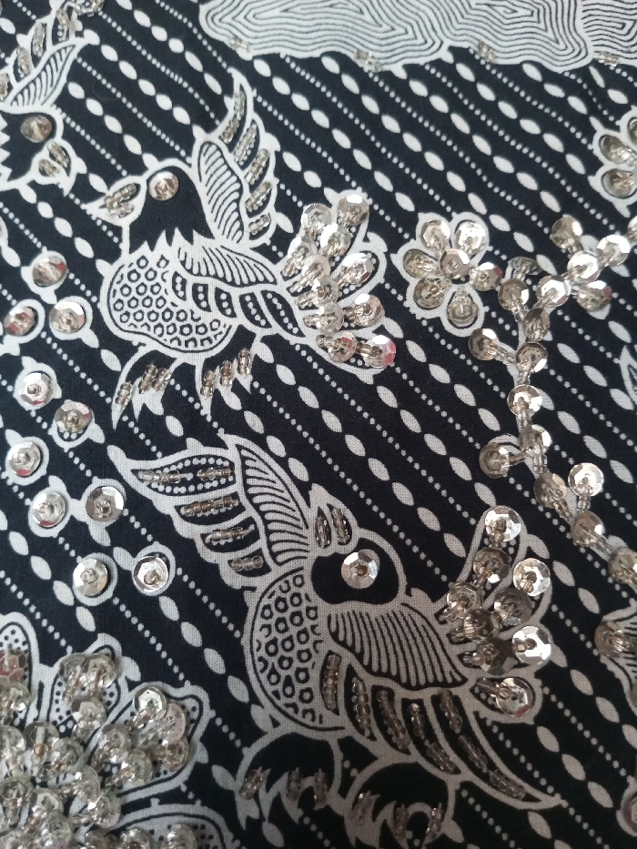 The image presents a textile featuring a black and white patterned design, embellished with shiny sequins