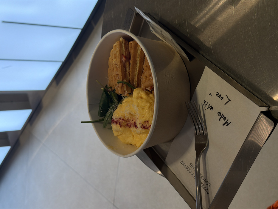 The image displays a single serving of food in a light-colored disposable cardboard bowl, positioned on a rectangular, scratched metallic tray. The bowl contains scrambled eggs topped with grated white cheese and a line of red spice, several stacked rectangular waffles with a visible reddish filling, and green leafy vegetables also topped with grated white cheese. A silver-colored metal fork rests on a folded white paper napkin to the left of the bowl; a metal knife is partially visible beneath the napkin. The napkin is printed with "SPECIALTY COFFEE LOVER CLUB" and handwritten with "Made with Love". The background features a light-colored floor and a large, brightly illuminated structure with vertical light-colored panels, indicative of an indoor commercial establishment. Based on the branding on the napkin, the location is a Specialty Coffee Lover Club cafe in the city of Yerevan, Armenia.