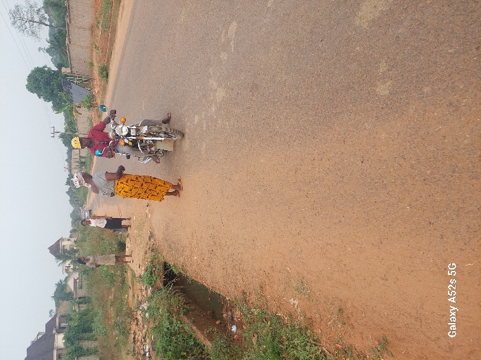 A man with a yellow helmet rides a motorcycle on a paved road next to a woman wearing a headscarf and yellow patterned skirt. Two other people stand farther down the road. The road is flanked by vegetation and buildings on one side and an unpaved area on the other. A drainage ditch runs parallel to the road. The sky is overcast. A phone's watermark is visible in the corner of the image.