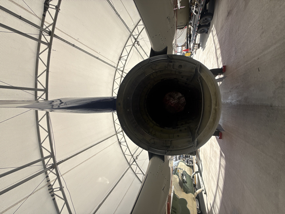 rear of an aircraft engine under a white-netted, arched structure. The engine exhaust nozzle is prominently displayed, revealing the interior details. Part of the aircraft's tail fin and fuselage are visible. In the background, other military vehicles and equipment are present, suggesting a museum or storage facility. The setting appears to be indoors, with bright lighting illuminating the engine and the surrounding area. The image is rotated and the camera is positioned behind the engine.