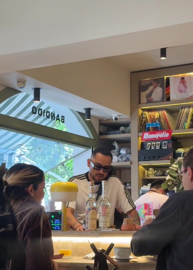 interior of a cafe or bar with patrons seated at a counter. A man with sunglasses and a white shirt with black stripes is standing behind the counter, next to bottles of mezcal or tequila. There's a lamp with a yellow shade, a temperature display showing 20.1 degrees Celsius and 23% humidity, and drinks on the counter. Shelves behind the counter hold various items including records and a Monopoly game. A sign outside reads "BandidO." People are talking and appear to be customers. The setting appears relaxed and modern.