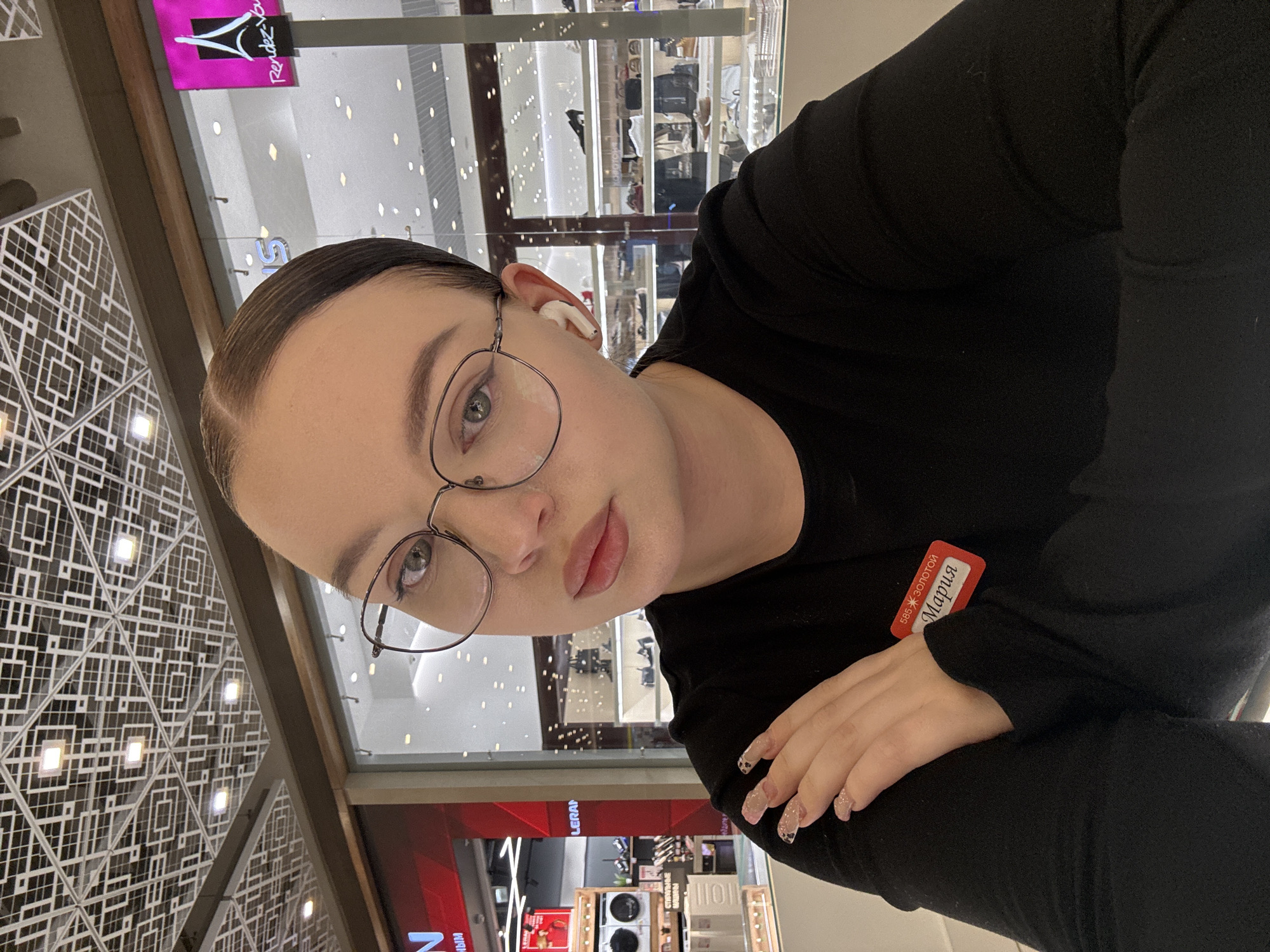 A woman identified as "Maria" wearing a black long-sleeved shirt and glasses poses for a photo. She has her hair pulled back and is wearing an earbud in her left ear. Her nametag identifies her as working for "585*золотой", a Russian jewelry chain. The photo appears to have been taken in the shopping mall, Mega, in Yekaterinburg, Russia, based on the background which shows various shops and the mall's interior architecture.