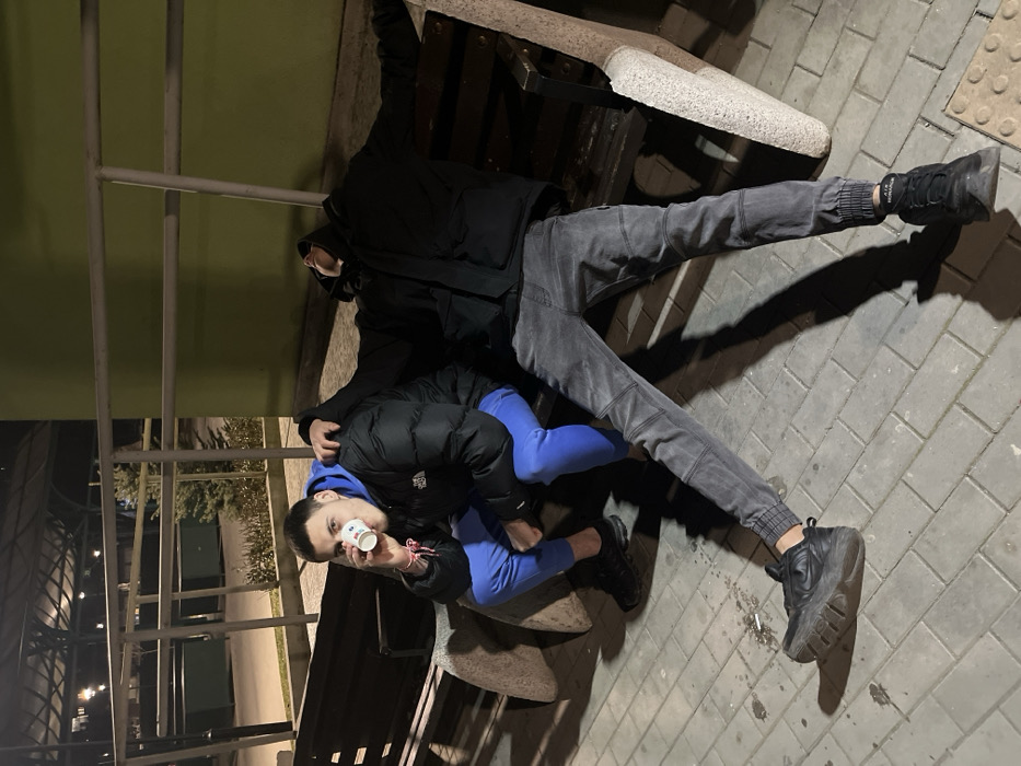 The image depicts an outdoor nighttime scene in the city of Mezdra, Bulgaria. Two young adult males are situated on a dark wooden and stone bench. The male on the left is seated, wearing a black puffer jacket over a blue hooded sweatshirt, blue sweatpants, and black athletic shoes. He is actively drinking from a small white disposable cup with a red and blue design, holding it to his mouth with his left hand. A red and white string is tied around his left wrist. His right arm extends over the shoulder of the male next to him. The male on the right is lying horizontally across the bench, wearing a black hooded jacket, grey cuffed jeans, and black athletic shoes. His head is tilted back, facing upwards, and his arms are outstretched, one over the first subject's shoulder. His legs are extended forward, with his right foot resting on the grey rectangular paved ground, which shows minor liquid stains. In the background, beyond a visible grey metal railing, is a light green wall and sparse vegetation. The area is illuminated by artificial light, casting distinct shadows from the subjects and the bench.