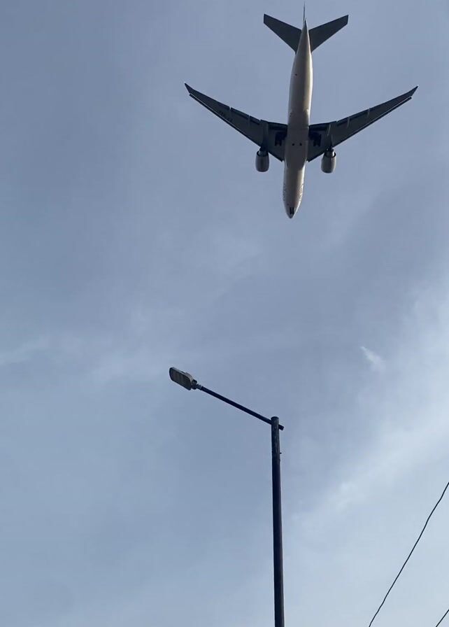street in a town, with buildings on either side. There are streetlights, power lines, and various vehicles on the road, including cars and motorcycles. People are seen walking on the sidewalk. As the video continues, an airplane flies overhead, appearing to be on approach to land. The plane is seen from below, with its engines and wings clearly visible. The sky is overcast, with a thin layer of clouds.