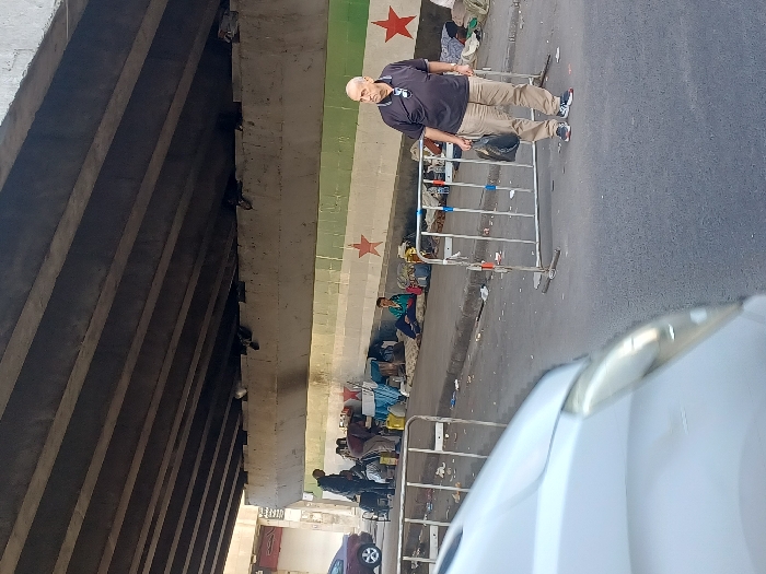 This image depicts a scene under an urban underpass in Sarouja Municipality, Syria. The overhead structure consists of concrete beams. A concrete retaining wall beneath the underpass is painted with horizontal green, white, and black stripes, featuring two prominent red five-pointed stars. In the immediate foreground, the front bumper and headlight of a white vehicle are partially visible on the left. On the asphalt road to the right of center, a bald, middle-aged man in a dark polo shirt, khaki pants, and dark athletic shoes stands facing left, holding a dark bag. Several white metal crowd control barriers are positioned along the edge of the asphalt and sidewalk, with one lying horizontally. Along the sidewalk beneath the underpass, a makeshift encampment is present. Multiple individuals are visible: one person stands on the far left, partially obscured; another is seated or crouched amidst an assortment of personal belongings including blankets, bags, and plastic containers. Further to the right, a person wearing a green top and dark pants is seated on a blanket. A fourth individual is lying down on the sidewalk to the far right. The area surrounding the encampment on both the sidewalk and road is littered with debris. In the background on the left, a dark red sedan is visible. The scene is illuminated by natural light.