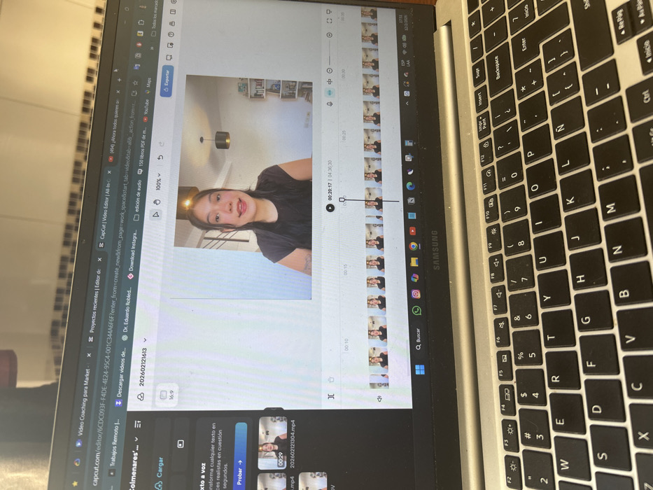 laptop screen displaying the CapCut video editing software. A woman's face is prominently featured in the editing preview window. The timeline below shows multiple clips of her. The screen also shows various editing options and tools within the software. The laptop keyboard is visible on the right side of the image, along with the Samsung branding. The taskbar at the bottom reveals other open applications and system icons. The surrounding background appears to be a kitchen countertop.