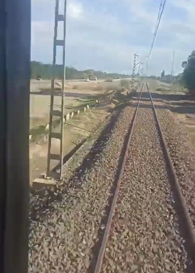 The video depicts a forward-facing view from a train moving along a railway track on a sunny day. The track is lined with gravel and stretches into the distance, flanked by dry, sandy terrain on either side. Overhead power lines and support structures run parallel to the track. A few scattered trees and buildings are visible in the background, adding to the scene.