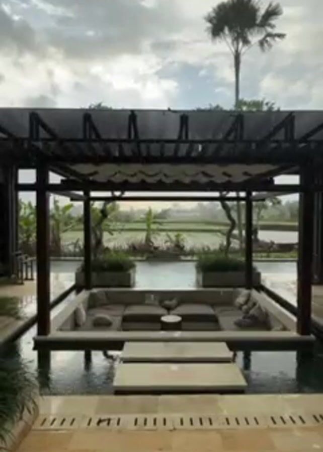 The scene depicts an outdoor lounge area in a rainy setting. The lounge is a square sunken space under a dark-colored, pergola-like structure with a light-colored fabric awning. Inside the sunken area is a built-in seating arrangement with several cushions. A small table sits in the middle. The sunken area is surrounded by water, creating a shallow pool around the seating. Beyond the lounge area, in the background, is a view of rice paddies. The sky is overcast and gray, with rain falling. A single palm tree is visible in the distance. The flooring in the foreground is light-colored stone or tile, wet from the rain. There are no people visible in the scene.