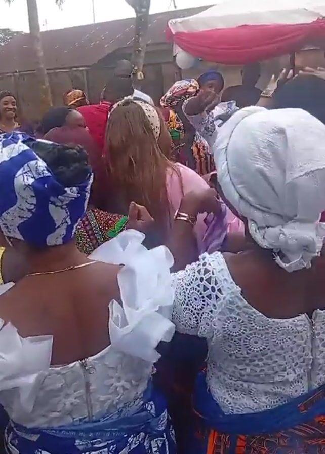 group of people dancing at an outdoor event. Most of the dancers appear to be women, wearing colorful traditional clothing and head wraps. They are moving energetically to the music, raising their hands and interacting with each other. A tent with red and white draping is visible in the background, along with trees and a building. Several men are walking among the crowd, seemingly observing the festivities. A young girl briefly enters the foreground, smiling widely at the camera before moving back into the crowd.