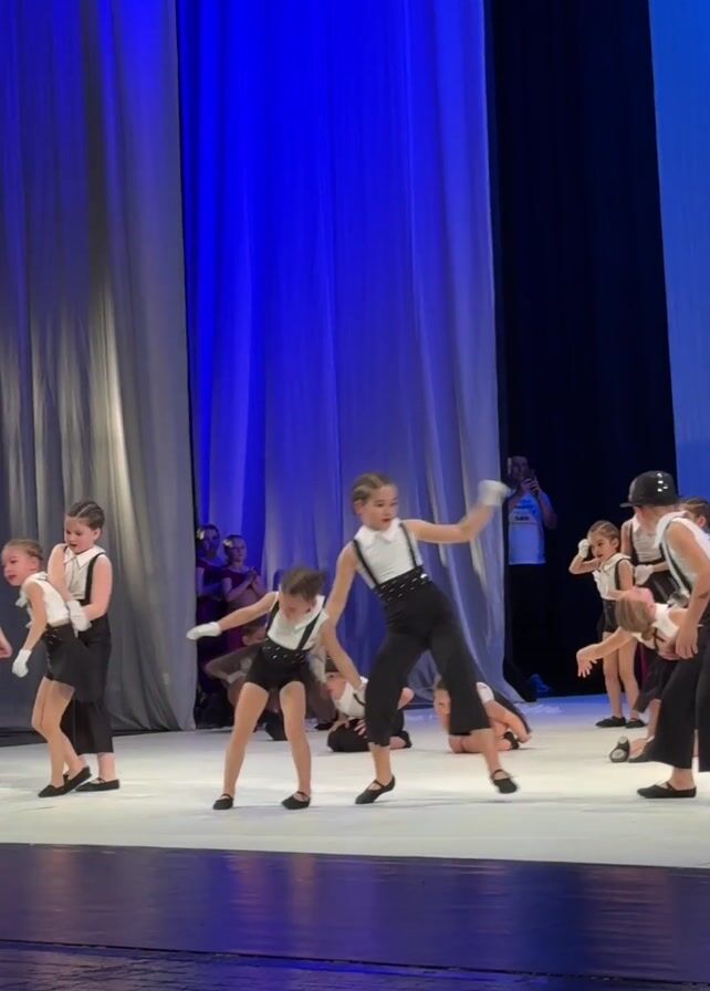 A dance troupe of approximately 15 young girls is performing on a brightly lit stage. They are all dressed in similar outfits: black pants or skirts with white shirts and suspenders. Some wear black hats, and all wear white gloves. They are performing a synchronized dance that includes movements like crawling, jumping, and pointing. The backdrop consists of blue and grey curtains. Several people are watching the performance, including some seated children and adults standing in the wings, some of whom are taking pictures with their phones. The stage floor is light-colored.