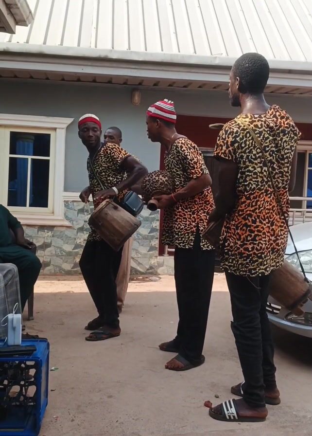 Four men are performing music outside in front of a light gray building with a white roof. Three of the men are playing drums while wearing matching black and orange patterned shirts and black pants. The drummer on the left wears a red and white striped hat and has a black shoulder bag. He is smiling. The second drummer also wears a similar hat and holds a smaller drum-like instrument. The third drummer looks to his left. The fourth man is standing behind them, partially obscured. A man in a green shirt is sitting on a chair to the left of the group. A blue crate and a white power adapter sit on the ground next to him. A silver car is parked near the building.