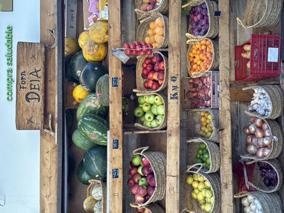 The image depicts a well-stocked produce display at a market stall or shop in Deià, Spain