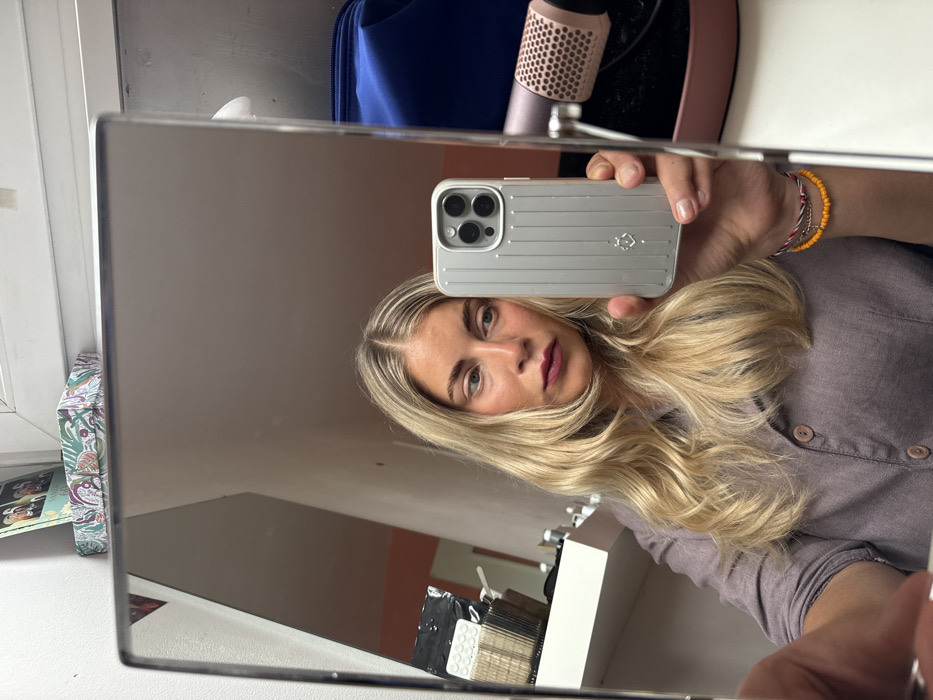 This image depicts a female subject taking a mirror selfie in what appears to be an indoor residential setting in Wattrelos, France