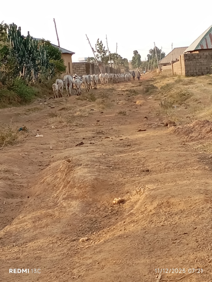 A dirt road stretches into the distance, flanked by buildings and sparse vegetation. A herd of cattle walks away from the viewer, followed by a person in the distance. The earth is dry and uneven. The image's timestamp is visible in the lower right corner.