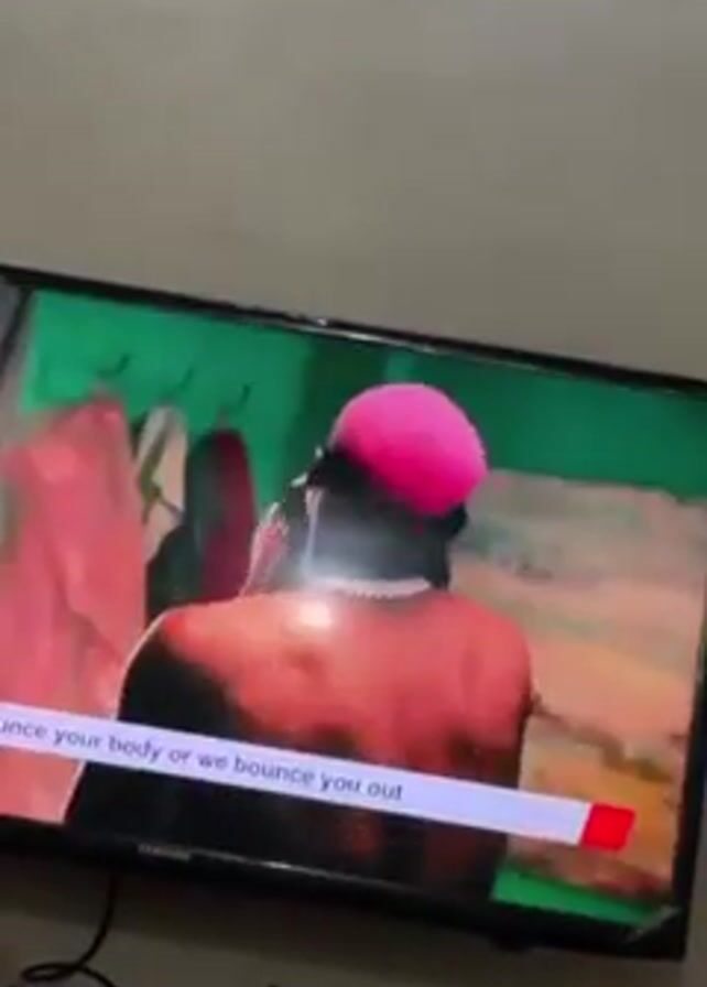 television screen displaying a music video. The video features multiple individuals in what appears to be a crowded, vibrant party setting. Some lyrics are displayed on the screen, including the phrases "bounce your body or we bounce you out" and "Omo no scream, no too shout." One of the featured people in the video is a man wearing a pink hat and a mesh tank top. There's also a woman with long blonde braids. The TV itself is a Samsung brand, sitting on a table, with an overhead light illuminating the wall. The camera appears to be hand held.
