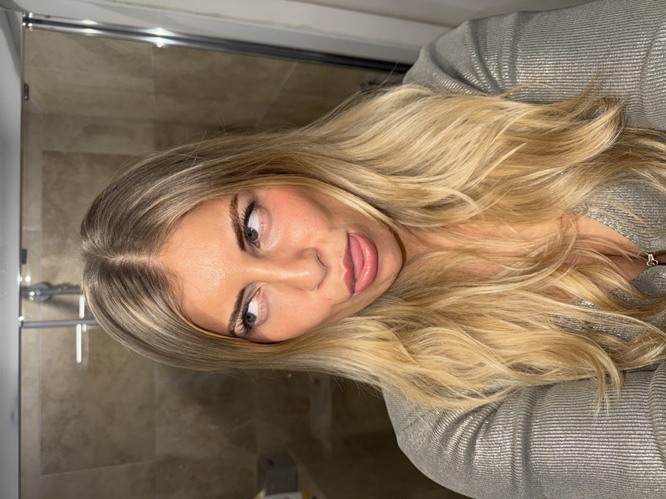 A blonde woman with dark roots poses for a selfie in what appears to be a bathroom, her tongue slightly protruding