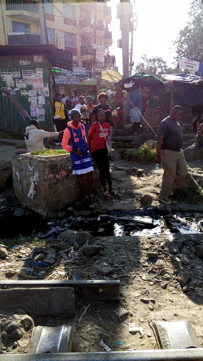 The image depicts a bustling urban street scene in Nairobi, Kenya, under bright sunlight. In the immediate foreground, a metal guardrail runs horizontally across the bottom, with an uneven, rocky, dirt-covered ground littered with debris. A small, dark, water-filled channel, resembling an open drainage ditch, traverses the mid-foreground, containing visible trash and reflecting sunlight. Two young adult females are prominent on the left midground, positioned near a large, grey concrete block that appears to be part of the drainage system or a barrier, heavily plastered with papers and flyers. One female, on the left, wears a blue and pink hooded jacket over a white and blue striped skirt, and dark sandals. The other, positioned slightly behind and to the right, wears a red t-shirt with white text, black pants, and light-colored sandals, carrying a small crossbody bag. To their left, partially obscured, a male in a light-colored hoodie is seen sitting on the ground or a low structure. Further to the right, a male in a dark grey t-shirt and khaki pants walks forward, carrying a small, light-colored object in his right hand. The background is densely populated with structures and people. A prominent green shipping container, repurposed, stands to the left, covered in numerous handwritten and printed advertisements for "VACANT SHOPS," "LOAN ON," and "FOR SALE" items. Behind it, multi-story buildings with yellow and red facades, balconies, and clothes hanging are visible. Overhead, a tangle of utility wires crosses the scene. To the right of the container, several informal market stalls constructed from tarpaulins, corrugated metal, and wooden poles line a dirt path, with various people moving and congregating. Signage for "FASHION" and "M-PESA" is visible. A tall cellular tower stands prominently in the far right background, with sparse trees and a bright, clear sky. The overall environment suggests a vibrant commercial area with a mix of permanent and informal structures, indicating an active urban environment with visible infrastructure and development.