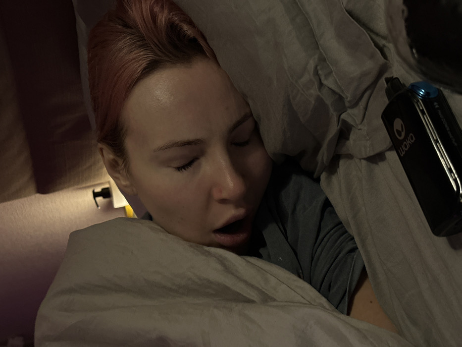A person with reddish-blonde hair sleeps with their mouth slightly open. They are lying in bed, surrounded by pillows and blankets, with a black Waka vape pen resting on the pillow next to their head. A dim light source is visible in the background, suggesting it's either early morning or nighttime in a dimly lit room.