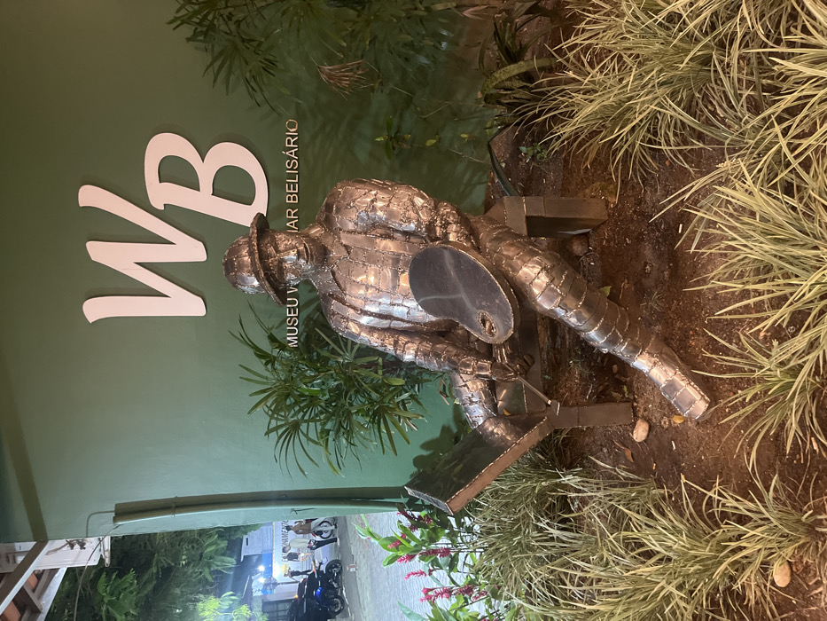 A metallic sculpture of a male figure is centrally positioned, seated on a minimalist bench in front of a solid green wall. The figure, constructed from numerous welded metal plates, wears a fedora-style hat, a jacket, and trousers. It holds a painter's palette in its left hand and a paintbrush in its right, directed towards a rectangular easel-like surface positioned to its left. On the green wall behind the sculpture, large white stylized letters "WB" are prominently displayed above the phrase "MUSEU VILMAR BELISÁRIO." This identifies the location as Museu Vilmar Belisário in Ilhabela, Brazil. The base of the sculpture and the area in front of the wall are adorned with various plants, including palm-like foliage directly behind the statue and variegated grassy plants in the immediate foreground. To the left of the scene, a paved street or public area is visible under artificial night lighting. This area contains parked vehicles, specifically a blue motorcycle, a black motorcycle, and parts of a dark car. Several indistinct human figures are discernible in the background of the paved area, indicating public activity. The overall scene is illuminated by artificial light, highlighting the metallic texture of the sculpture and the signage.