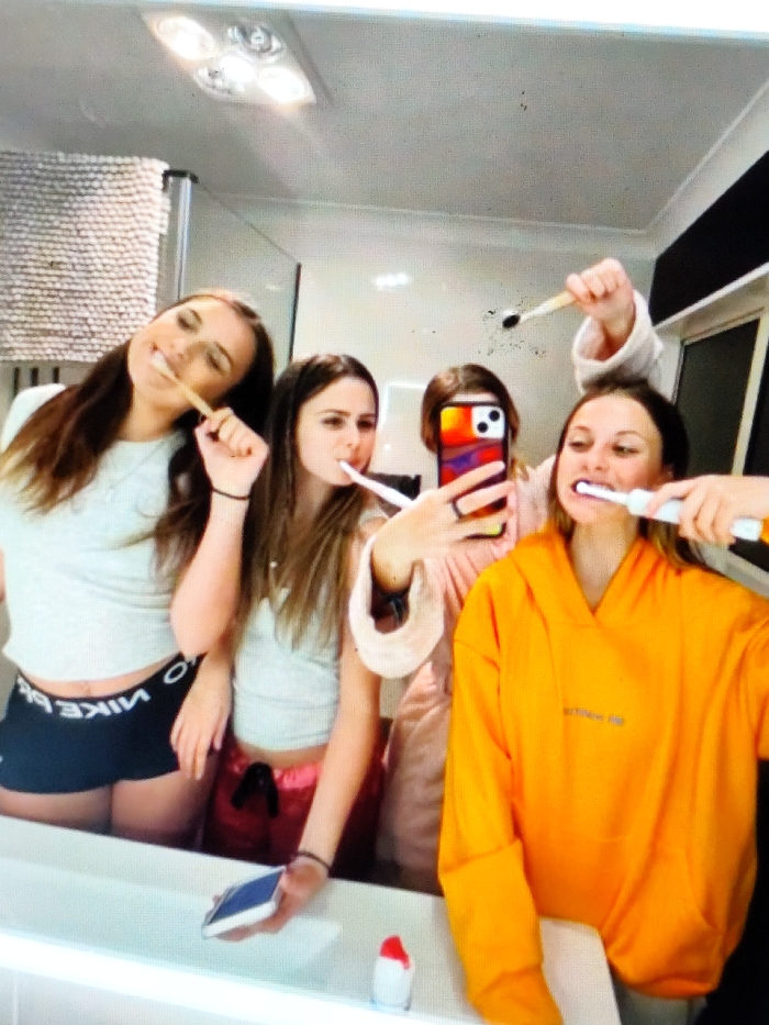 Four young adult females are depicted in a bathroom in Sysmä, Finland, captured in a mirror selfie while holding toothbrushes